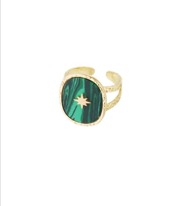 De ring is mega trendy en daarnaast perfect te combineren met meerdere matchende ringetjes! De ring is gemaakt van stainless steel en steen en is one size. Doordat de ring one size is, kun je de ring ideaal naar elke vorm van jouw vingers buigen. Gouden ring met ronde vintage steen en een klein sterretje. Verkrijgbaar in de kleuren goud-groen, goud-blauw, goud-roze, goud-beige.